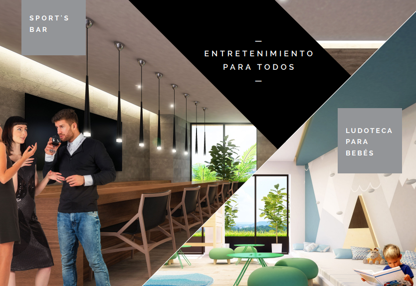 Espacios para trabajar y estudiar como área de coworking, business center y aula de usos múltiples, además de espacios de entretenimiento para todas las edades como cine, sport’s bar y ludoteca para niños.